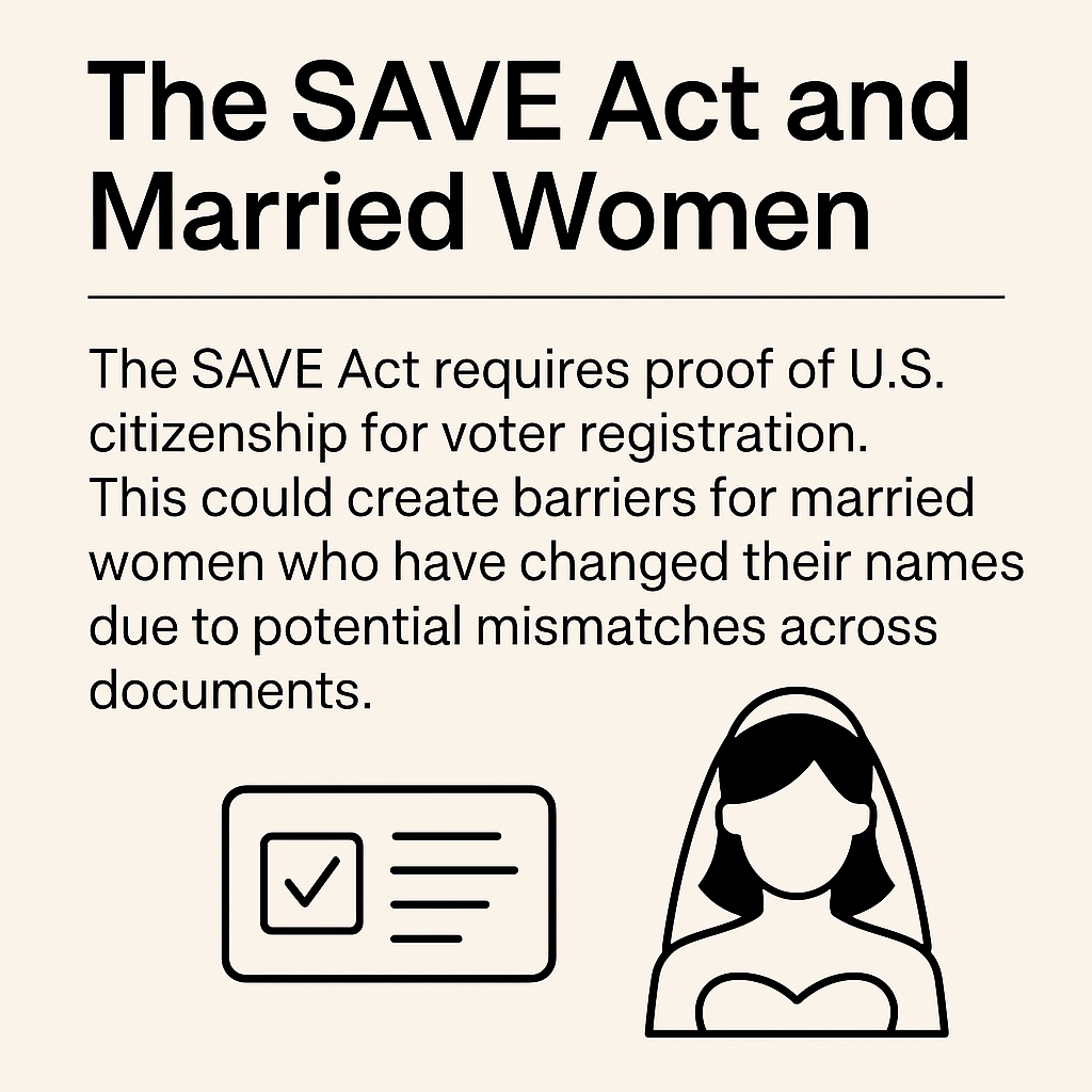 In summary, the SAVE Act does not explicitly bar married women (or any group) from voting, but its stringent proof-of-citizenship mandate could disproportionately burden women who changed their names after marriage. By requiring documents like birth certificates or passports for voter registration, the bill introduces a name-matching problem that affects tens of millions of married women whose legal names no longer match their birth records. History shows that such mismatches are not mere hypotheticals – they have caused real barriers under state-level voting laws in the past.